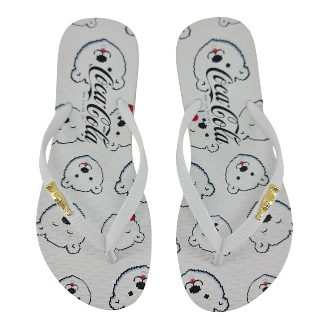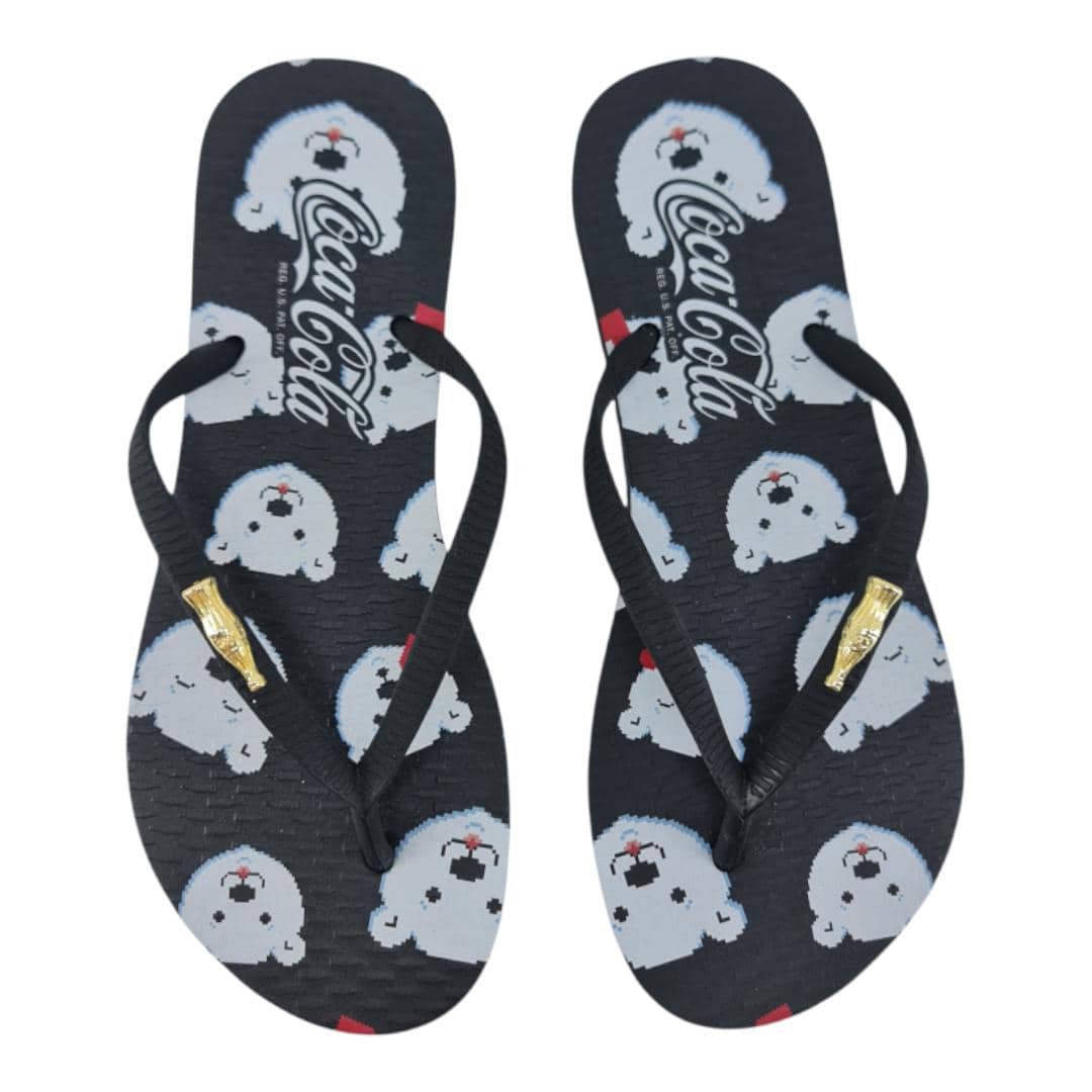 Este chinelo feminino traz estampa divertida de ursos polares, combinada ao clássico preto, garantindo um visual moderno e descontraído para o dia a dia.