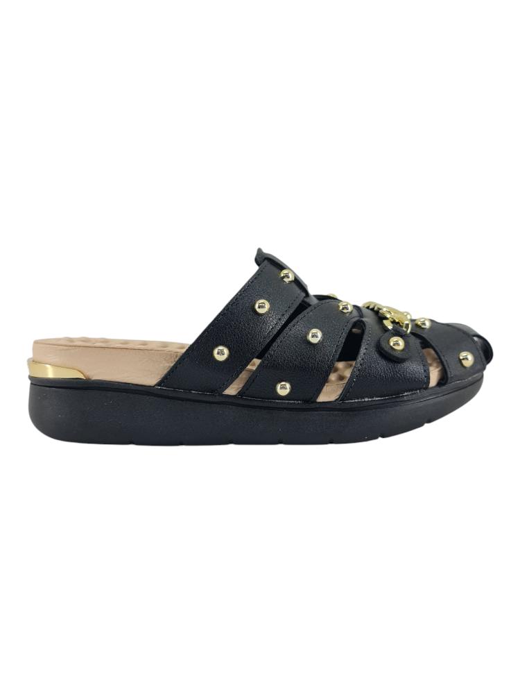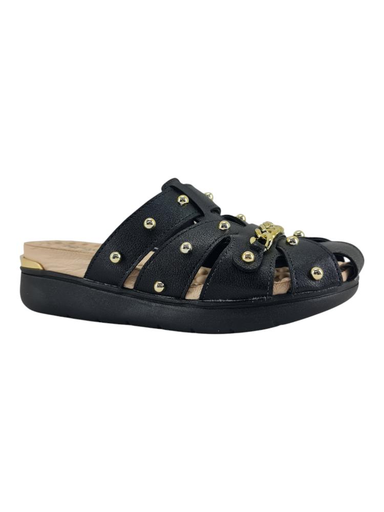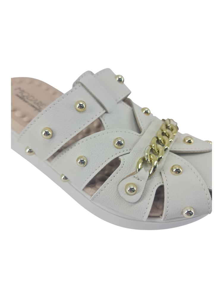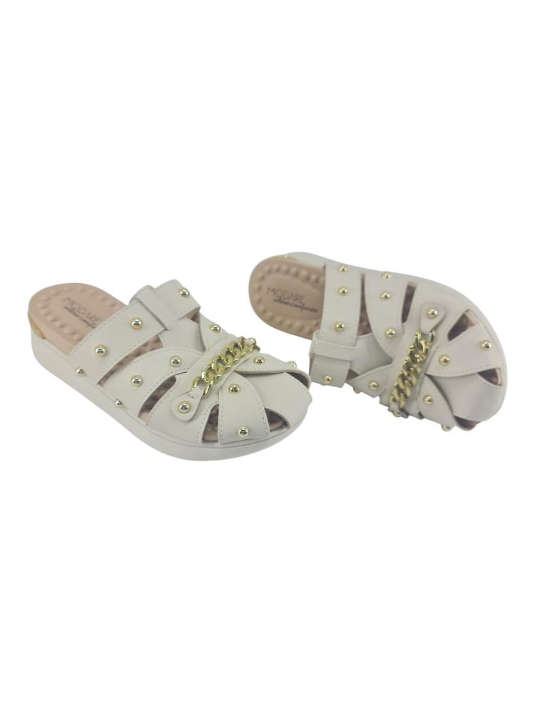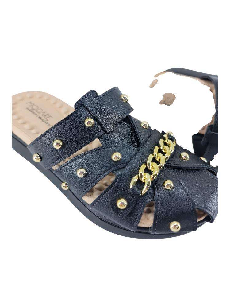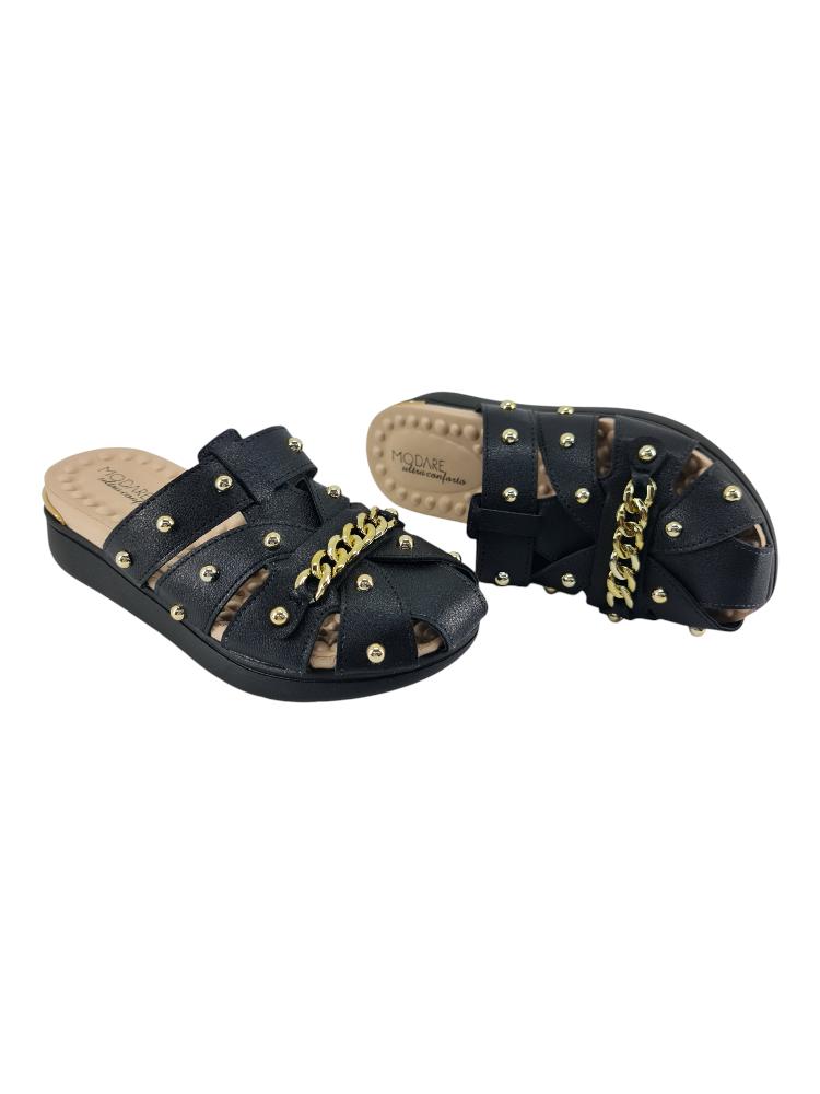 Conforto e estilo em um só calçado! Este mule Modare traz um design moderno com tiras vazadas e aplicação de tachas douradas, que dão um toque de sofisticação ao modelo. Possui solado anatômico que proporciona bem-estar durante o uso e detalhe dourado no calcanhar para um charme extra. Ideal para quem busca praticidade sem abrir mão da elegância no dia a dia.