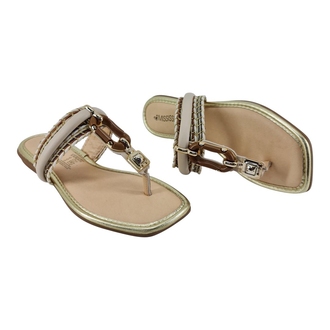 Com tiras trançadas, detalhe e acabamento dourado, ela combina conforto e sofisticação para qualquer ocasião.
