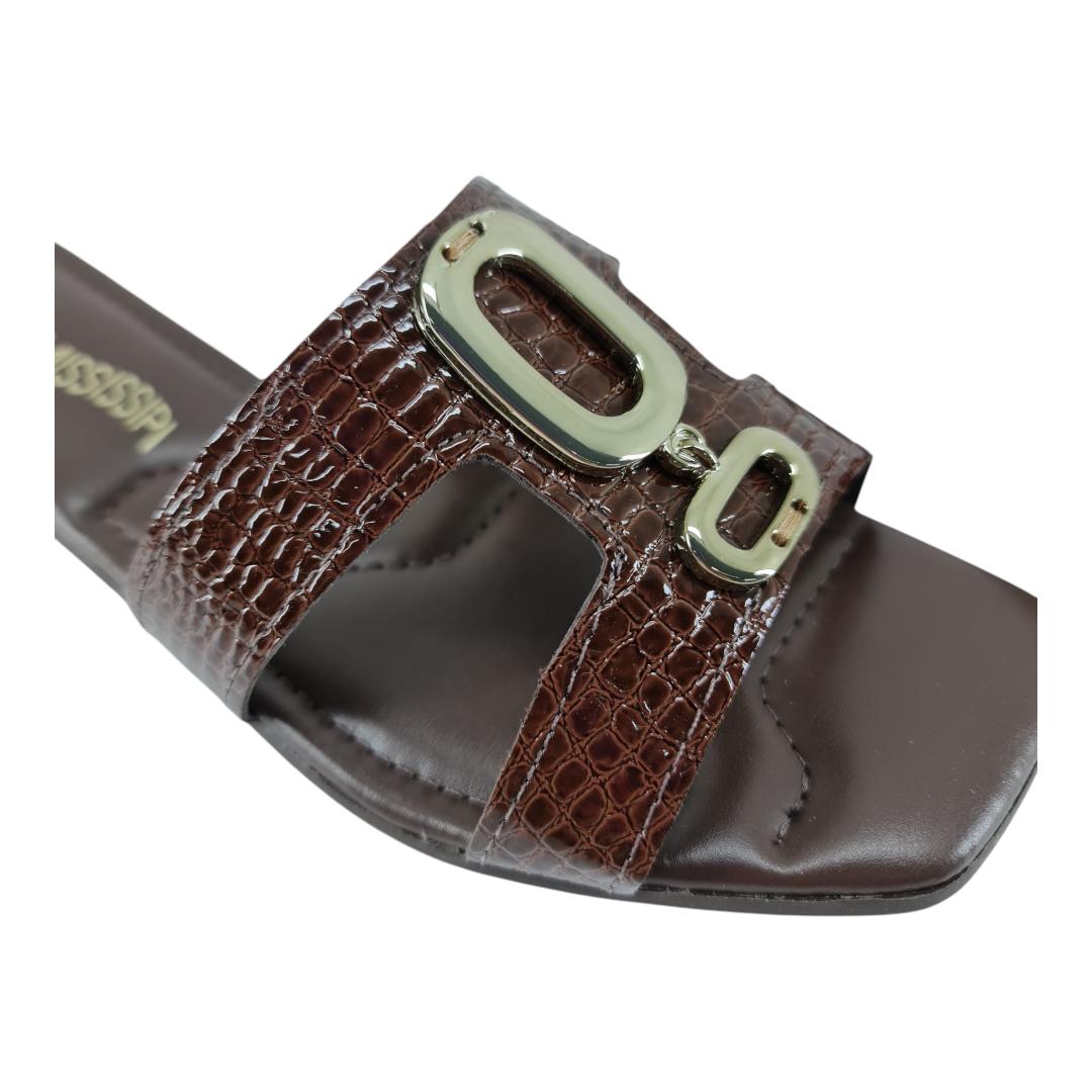 Cheia de charme e versatilidade, a rasteira Mississipi é perfeita para acompanhar seus looks do dia a dia com muito estilo. O cabedal em tiras com textura croco traz um toque sofisticado, enquanto a aplicação metálica no centro garante ainda mais elegância.