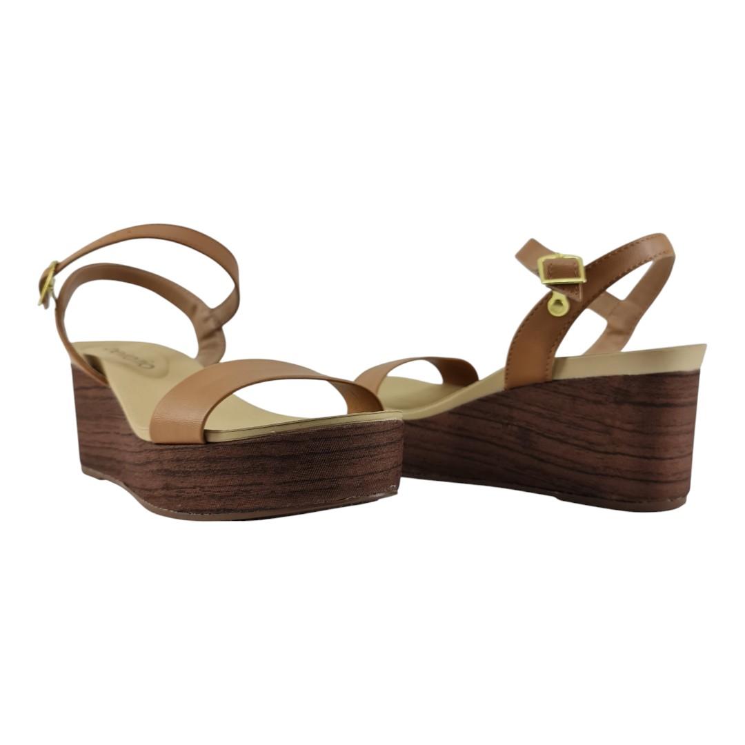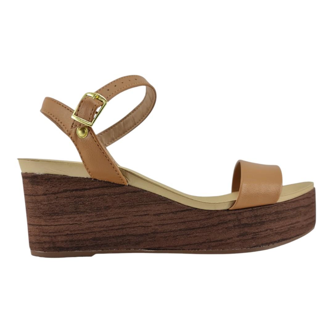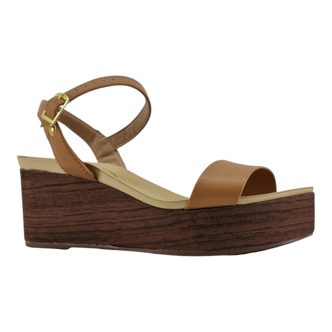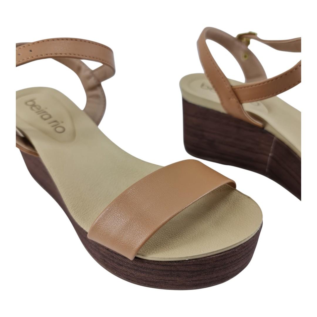 Sandália Beira Rio possui salto plataforma com acabamento que imita madeira, tira frontal larga em tom caramelo e fechamento no tornozelo com fivela dourada. Um modelo moderno e confortável, perfeito para compor looks casuais e elegantes.