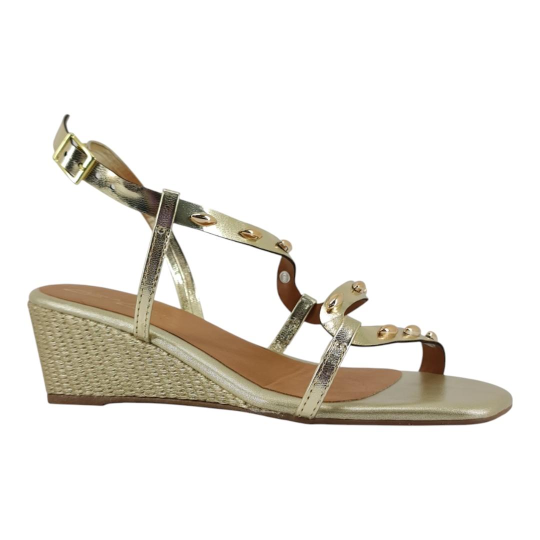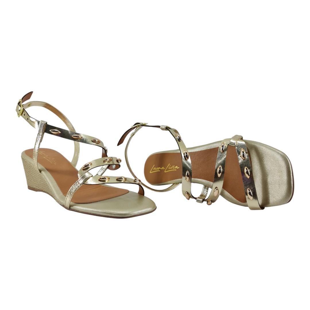 O design com tiras delicadas e aplicações metálicas proporciona um visual diferenciado, além de garantir firmeza e conforto ao caminhar.