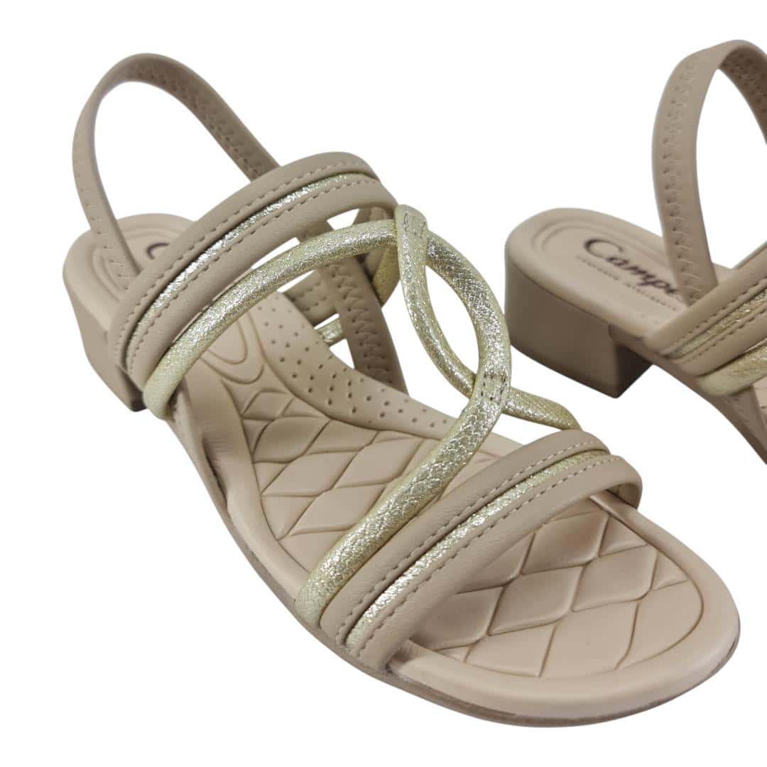 Sandália feminina Campesi com salto baixo, perfeita para quem busca conforto aliado ao estilo no dia a dia. O modelo conta com tiras macias com detalhe metalizado, que trazem um toque sofisticado ao visual. Possui palmilha anatômica super macia, garantindo bem-estar durante todo o uso, além do calcanhar com elástico que facilita o calce e oferece melhor ajuste. Ideal para compor looks casuais e elegantes com leveza e praticidade.