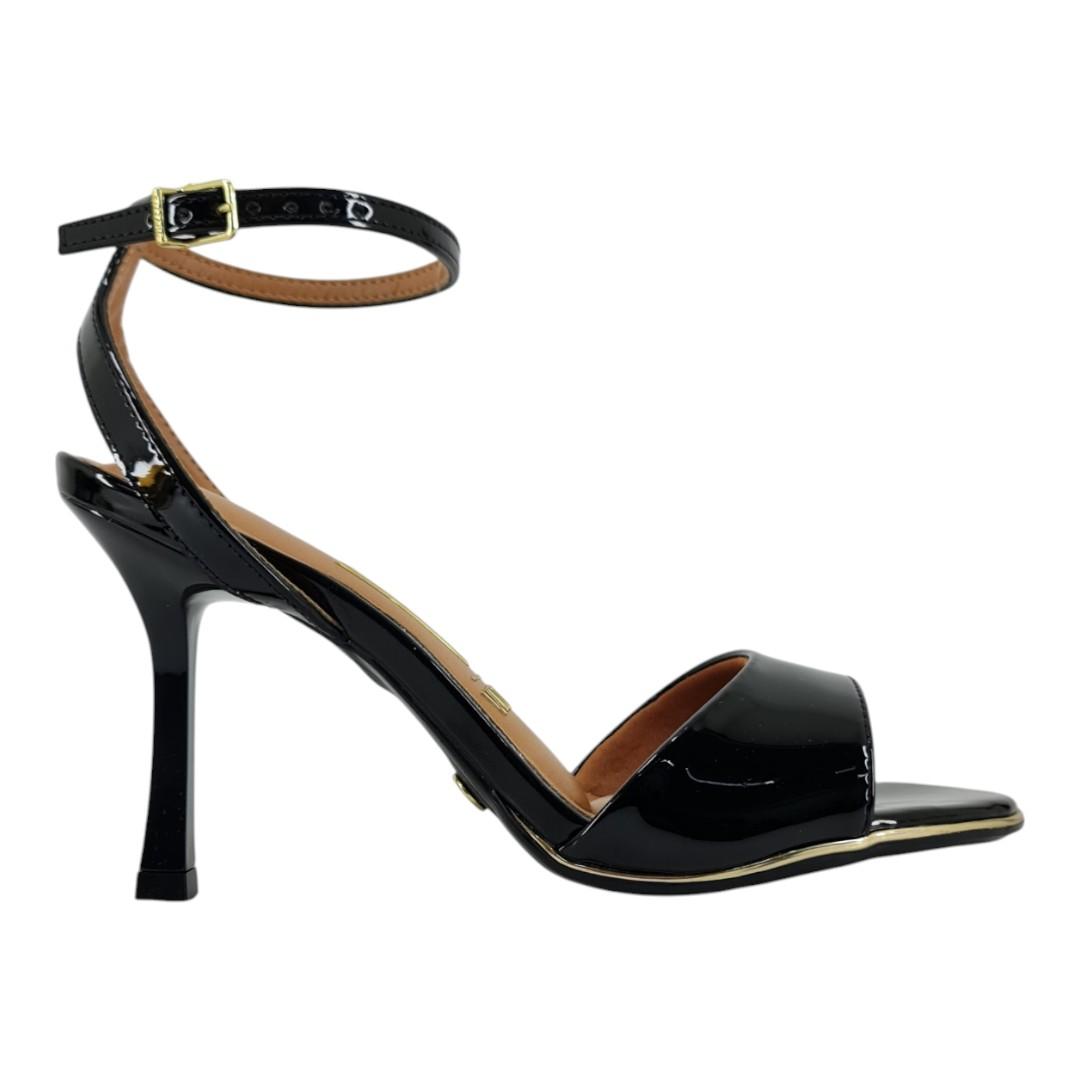 O modelo em verniz preto possui tira única frontal, fechamento com fivela no tornozelo e salto fino, perfeito para produções sofisticadas e atemporais, desde festas até combinações modernas no dia a dia.