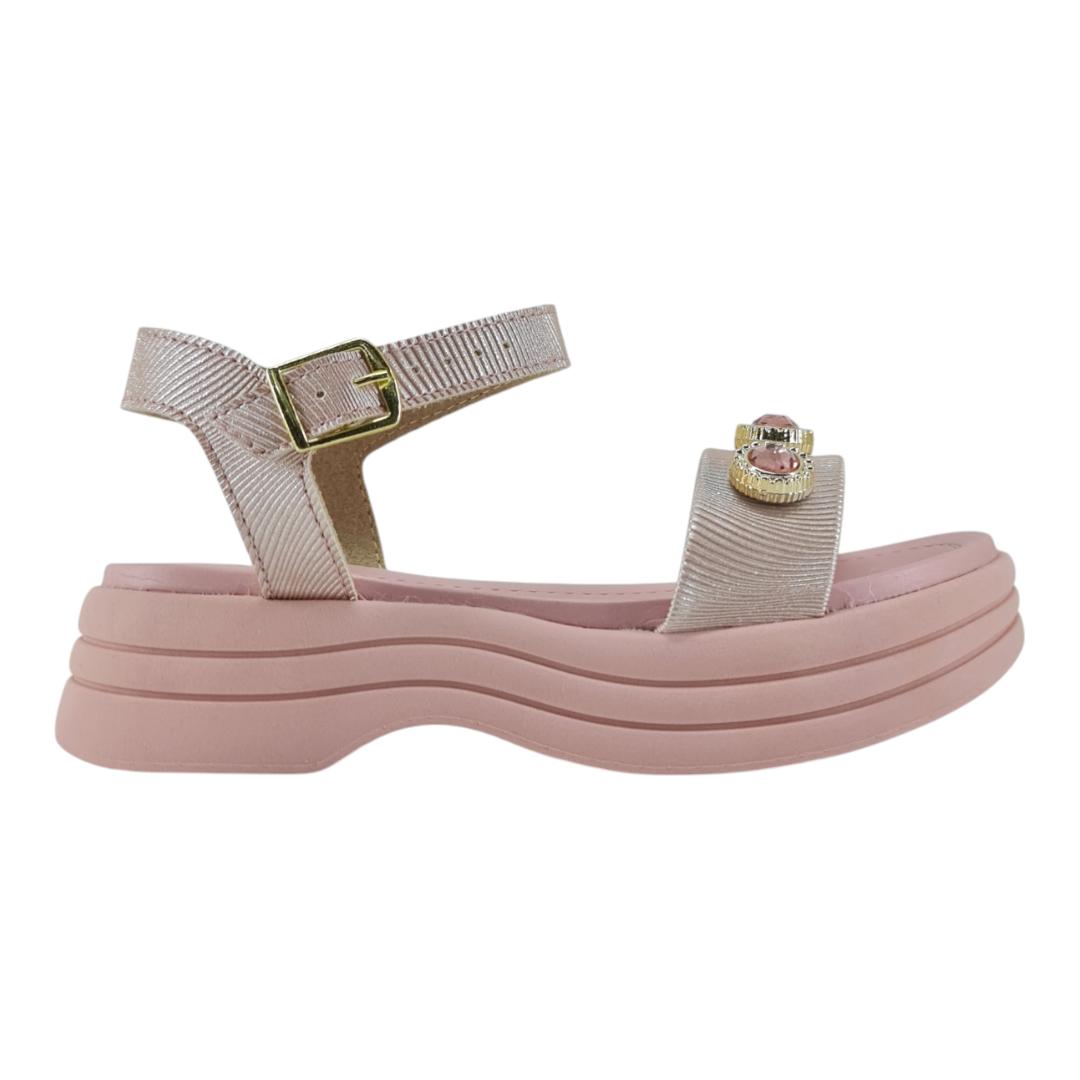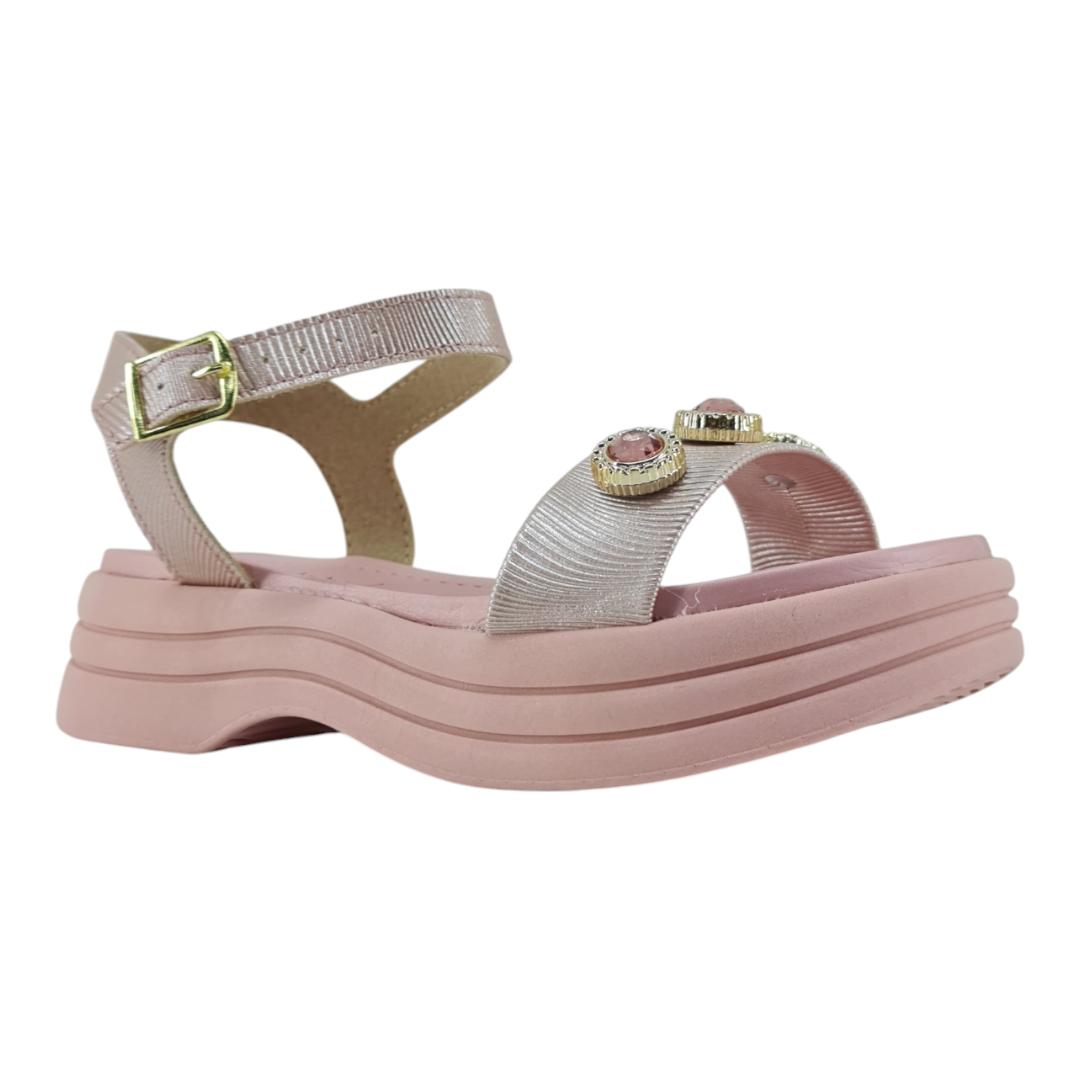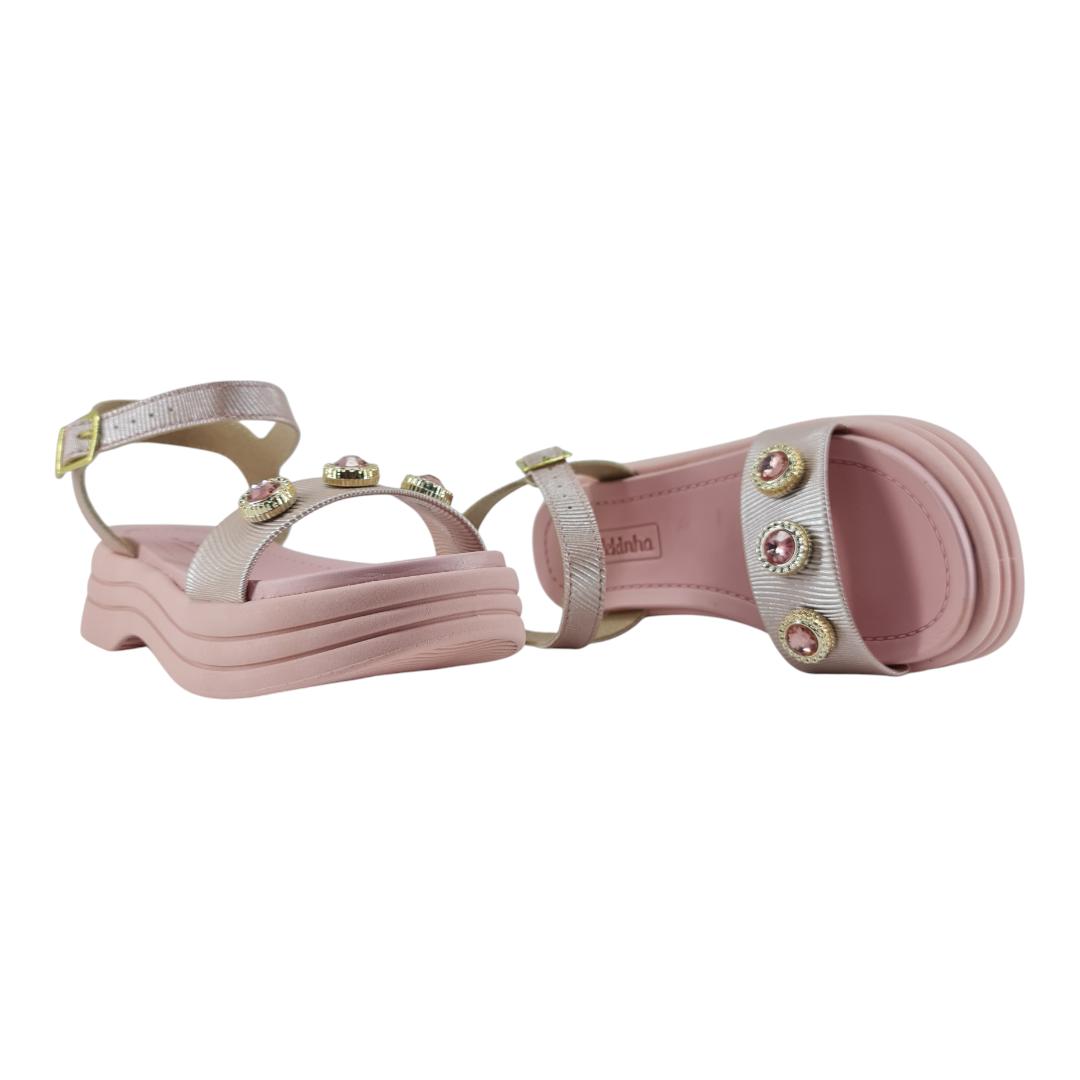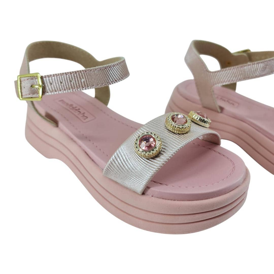 Cheia de charme e conforto! Essa sandália Molekinha vem com plataforma leve, tiras metalizadas e aplicações de pedrinhas brilhantes que deixam o look ainda mais encantador. O modelo possui ajuste com fivela e palmilha macia, garantindo segurança e bem-estar para os pezinhos.