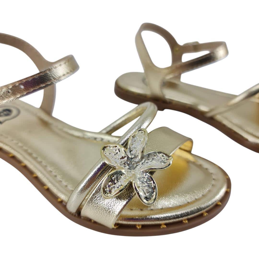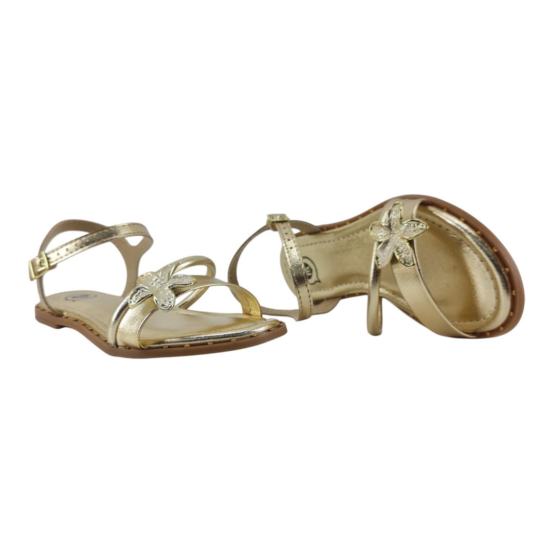 Sandália dourada com acabamento delicado, perfeita para o dia a dia ou eventos.