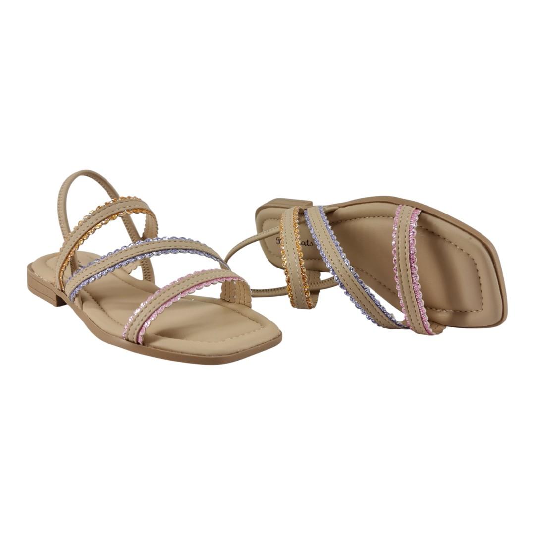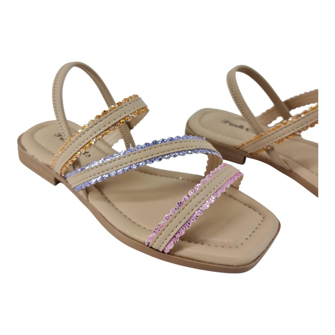 Com tiras em tom nude decoradas com detalhes coloridos (rosa, lilás e dourado), ela traz um visual moderno e alegre, perfeito para compor looks confortáveis e estilosos para as meninas.