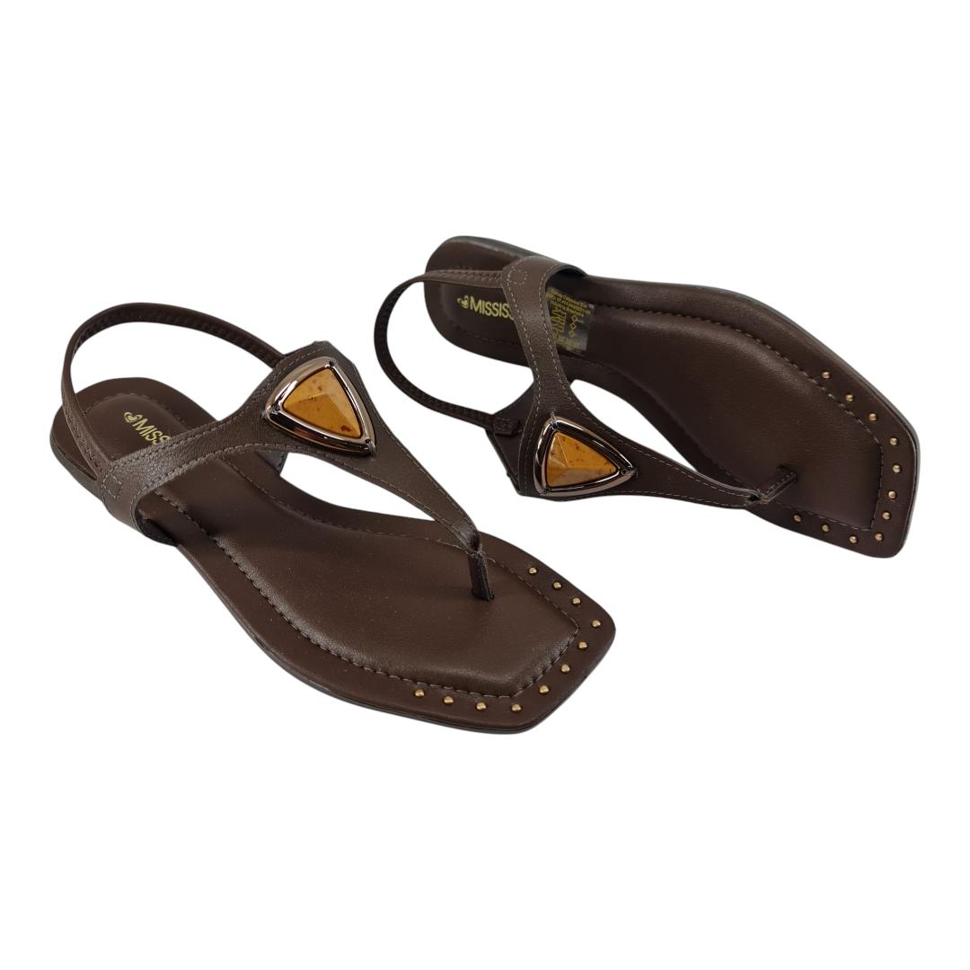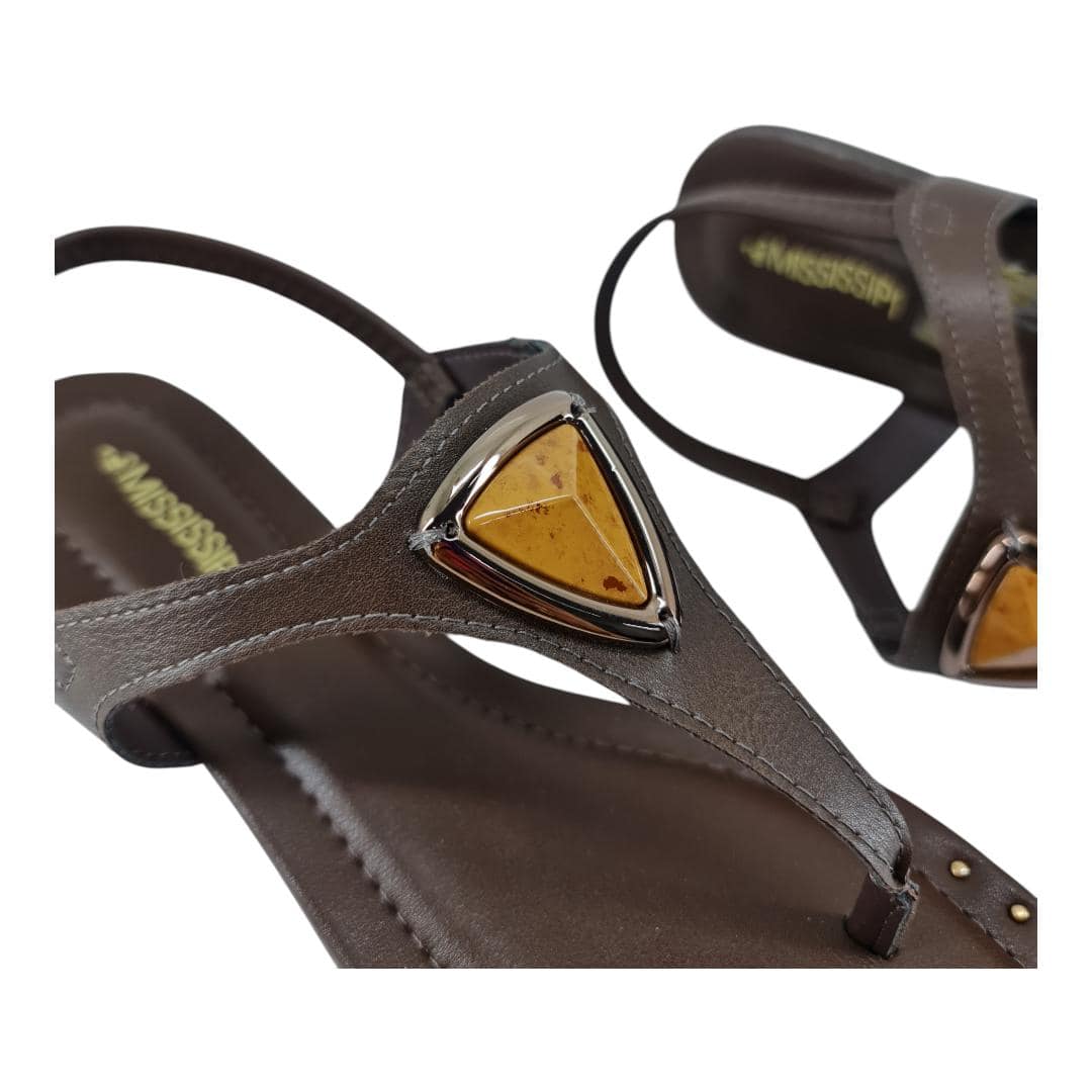 Essa é uma sandália rasteira Mississipi, um modelo delicado e versátil para compor looks casuais com muito estilo. Em tom marrom, possui tiras finas com detalhe em aplicação geométrica no cabedal, garantindo um charme especial. Leve e confortável, é perfeita para o dia a dia, combinando praticidade e elegância em um único calçado.