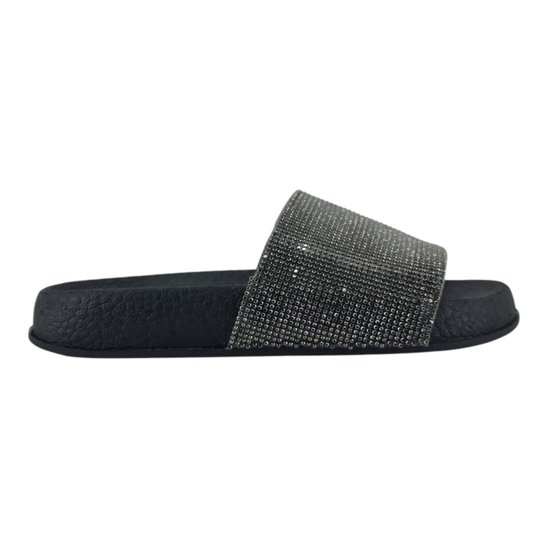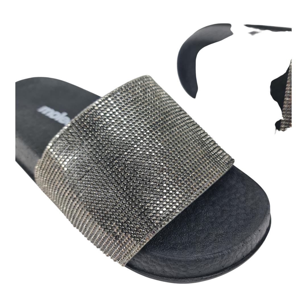 O modelo tem cabedal todo trabalhado com aplicação de pedrarias brilhantes, que trazem um toque de glamour e deixam o calçado perfeito tanto para looks casuais quanto para composições mais elegantes.