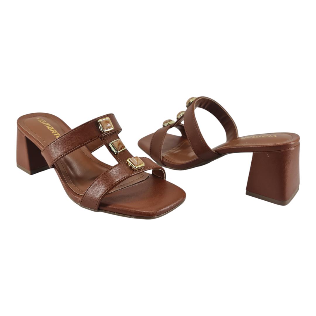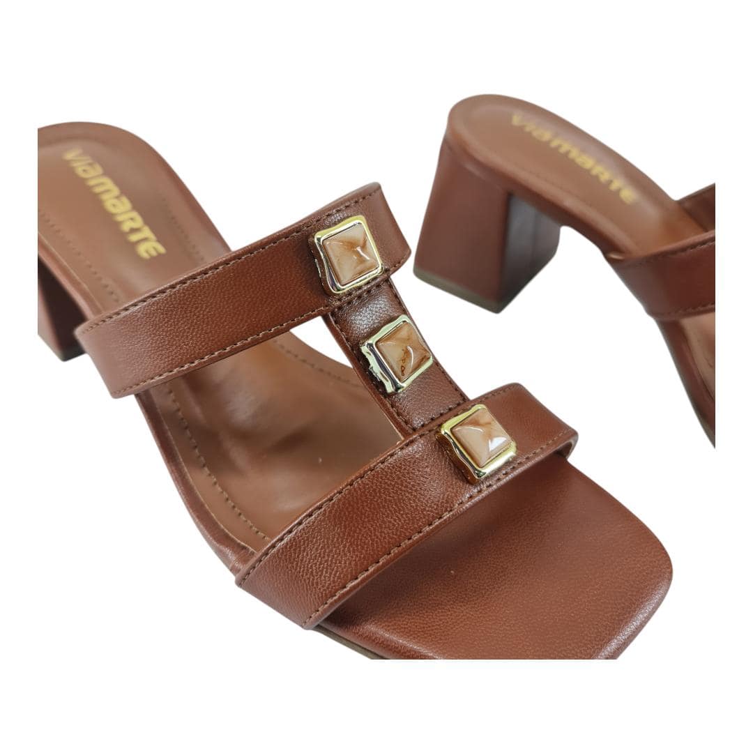 Com duas tiras largas em marrom, detalhe em aplicações metálicas sofisticadas e salto bloco médio, ele garante estabilidade e charme ao caminhar. Versátil, combina facilmente com vestidos, saias e calças, sendo ideal tanto para o dia quanto para a noite.