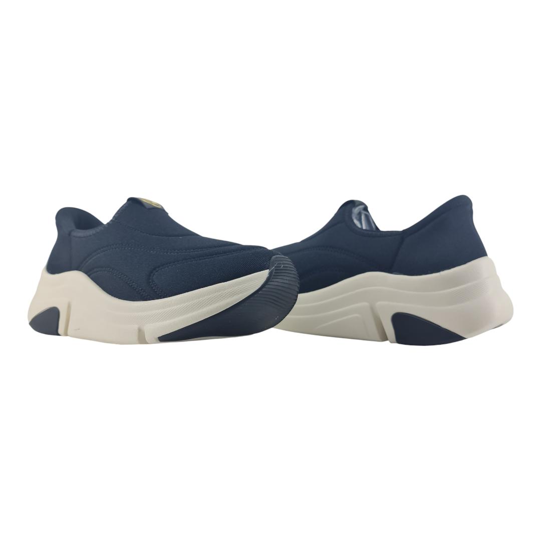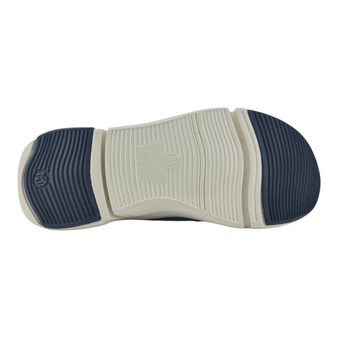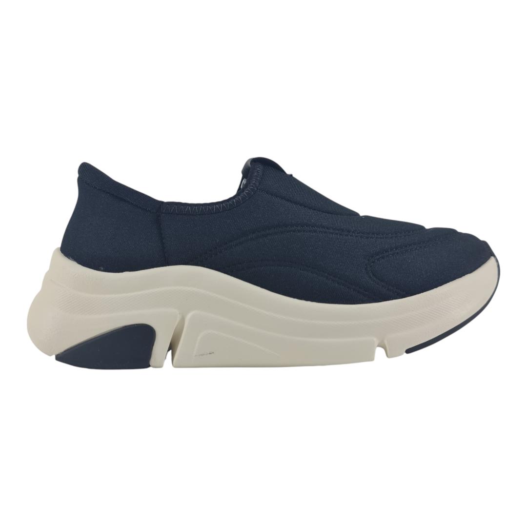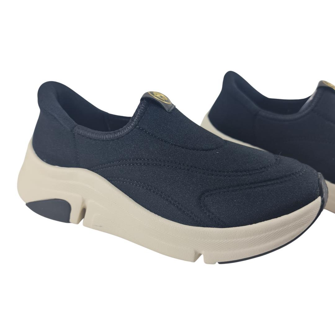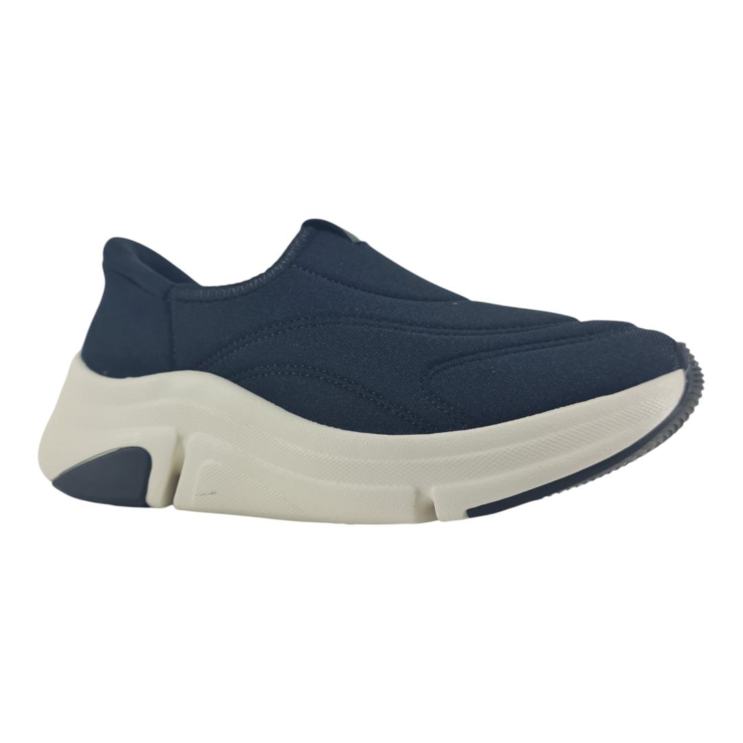 Ele tem um design moderno e confortável, com cabedal em tecido (parece lycra ou malha elástica), solado alto e anatômico em tom claro e modelo slip on (sem cadarço), que facilita o calce.