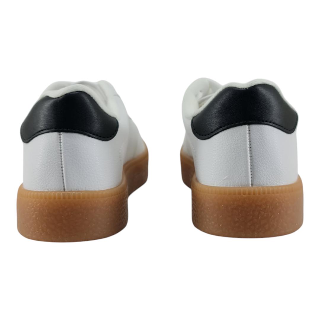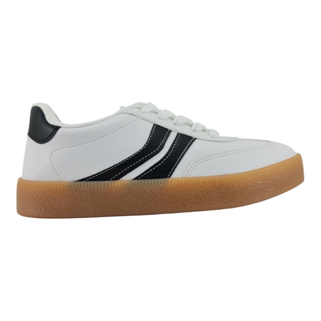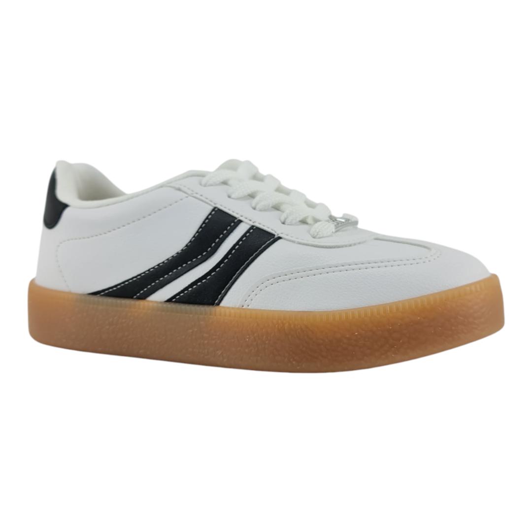 Esse tênis casual feminino combina o visual clássico do branco com detalhes em preto e um solado caramelo que traz um toque retrô e moderno ao mesmo tempo. Ideal para o dia a dia, ele é versátil e fácil de combinar com diferentes estilos de roupa.
